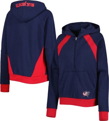 The Women's Starter Navy Columbus Blue Jackets Wishbone Half-Zip Hoodie is the perfect way to show your support for the Columbus Blue Jackets. This midweight hoodie is made from a soft cotton and polyester blend, featuring embroidered graphics, a fleece lining, and a front pouch pocket. Mesh insets and raglan sleeves provide breathability and comfort, while rib-knit insets and thumbhole cuffs ensure a snug fit. Whether you're cheering on the Blue Jackets at the rink or relaxing at home, this hoodie will keep you warm and comfortable.