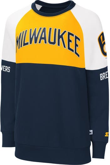 The Women's Starter Navy/Gold Milwaukee Brewers Baseline Raglan Pullover Sweatshirt is the perfect way to show your support for the Milwaukee Brewers. Made from a comfortable cotton and polyester blend, this lightweight sweatshirt features a microfleece lining for added warmth during chilly game days. The raglan sleeves and screen-printed graphics add a stylish touch, while the crew neck and embroidered fabric appliqu proudly display your Milwaukee Brewers pride. Whether you're cheering from the stands or simply showing your support, this sweatshirt is the perfect way to represent the Milwaukee Brewers in style.