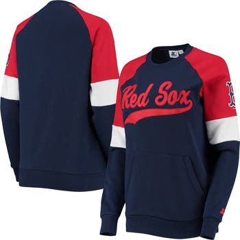 The Women's Starter Navy/Red Boston Red Sox Playmaker Raglan Pullover Sweatshirt is the perfect way to show your support for the Boston Red Sox. This midweight sweatshirt is made from a soft cotton and polyester blend, featuring embroidered graphics, a fleece lining, and a front pouch pocket. The raglan sleeves and pullover design make it easy to wear, while the Boston Red Sox logo proudly displayed on the chest showcases your team spirit. Whether you're cheering on the Red Sox at Fenway Park or relaxing at home, this sweatshirt ensures both comfort and style.