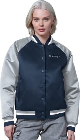 Relive the glory days of the Dallas Cowboys with this vintage-inspired Starter Satin Full-Snap Vintage Varsity Jacket . This eye-catching jacket pays homage to the team's rich history with its throwback logo appliqu on the back and embroidered team name on the chest. The satin fabric offers a lustrous finish, while the relaxed fit ensures comfort and freedom of movement. Perfect for moderate temperatures, this midweight jacket features a tri-color, rib-knit stand-up collar, cuffs, and hem, along with two side pockets for convenient storage. A locker loop adds a touch of practicality, making it a must-have for any fan looking to showcase their team pride in retro fashion.