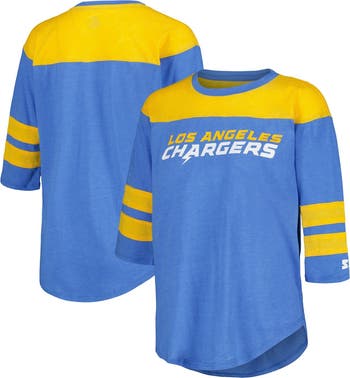 The Starter Women's Powder Blue Los Angeles Chargers Fullback Tri-Blend 3/4-Sleeve T-Shirt is the perfect way to show your support for the Los Angeles Chargers. Made from a comfortable polyester, cotton, and rayon blend, this shirt features screen print graphics and sewn-on stripes that proudly display your team pride. The loose fit and rounded droptail hem provide a relaxed and stylish look, while the crew neck ensures a comfortable fit. Whether you're cheering on the Chargers at the stadium or just relaxing at home, this shirt is sure to become a favorite.
