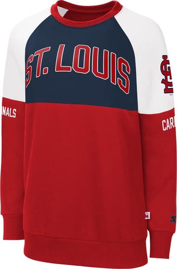 The Women's Starter Red/Navy St. Louis Cardinals Baseline Raglan Pullover Sweatshirt is the perfect way to show unwavering support for the St. Louis Cardinals. Made from a comfortable cotton and polyester blend, this lightweight sweatshirt is ideal for mild temperatures. Raglan sleeves and microfleece lining enhance comfort and warmth, while screen-printed graphics proudly display Cardinals pride. Whether cheering from the stands or showing support, this sweatshirt stylishly represents the St. Louis Cardinals.