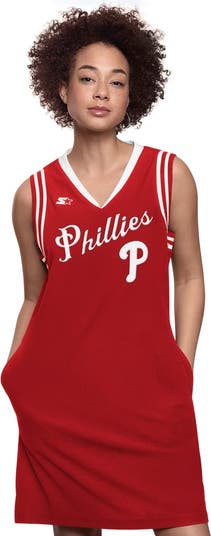 Take your Philadelphia Phillies fandom up a notch with this Fast Track Sneaker V-Neck Dress from Starter. This stylish and sporty dress features an embroidered team name and logo across the chest for a touch of Philadelphia Phillies pride. With a flattering v-neck and sleeveless design, this dress is perfect for warm weather and can easily be dressed up or down.