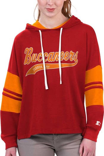 The Women's Starter Red Tampa Bay Buccaneers Bump And Run Long Sleeve Hoodie T-Shirt is the perfect way to show your unwavering support for the Tampa Bay Buccaneers. This lightweight hoodie features screen-print graphics and sewn-in contrasting color stripes that proudly display your team spirit. The droptail hem with side splits and ribbed cuffs provide a comfortable and stylish fit, while the French terry lining ensures warmth on chilly game days. Whether you're cheering from the stands or simply showing your support, this hoodie is a must-have for any true Tampa Bay Buccaneers fan.