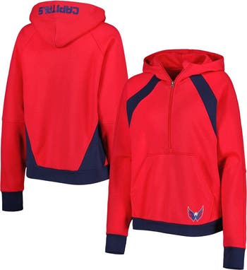 The Women's Starter Red Washington Capitals Wishbone Half-Zip Hoodie is the perfect way to show your support for the Washington Capitals. This midweight hoodie is made of a soft cotton and polyester blend, featuring embroidered graphics, a front pouch pocket, and a scuba hood without a drawstring. Mesh insets and rib-knit insets add a stylish touch, while thumbholes in the cuffs keep your hands warm. Whether you're cheering on the Capitals at the game or relaxing at home, this hoodie ensures comfort and style.