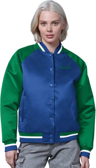 Relive the glory days of the Seattle Seahawks with this vintage-inspired Starter Satin Full-Snap Vintage Varsity Jacket . This eye-catching jacket pays homage to the team's rich history with its throwback logo appliqu on the back and embroidered team name on the chest. The satin fabric offers a lustrous finish, while the relaxed fit ensures comfort and freedom of movement. Perfect for moderate temperatures, this midweight jacket features a tri-color, rib-knit stand-up collar, cuffs, and hem, along with two side pockets for convenient storage. A locker loop adds a touch of practicality, making it a must-have for any fan looking to showcase their team pride in retro fashion.