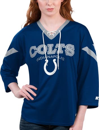 The Women's Starter Royal Indianapolis Colts Rally Lace-Up 3/4 Sleeve T-shirt is the perfect way to show unwavering support for the Indianapolis Colts. Screen-printed graphics and sewn-on sleeve stripes proudly display team spirit. The V-neck and lace-up neckline add style, while the rounded droptail hem ensures a comfortable fit. Made from durable polyester, this T-shirt is ideal for cheering on the Colts at the stadium or showcasing support around town.