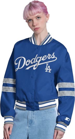 Step up to the plate with the Los Angeles Dodgers in this Starter Royal Los Angeles Dodgers Interception Full-Snap Varsity Jacket, a modern take on a timeless classic. The lightweight satin fabric provides a sleek look and feel ideal for mild weather, while the embroidered fabric applique team wordmark across the chest boldly declares your Dodgers devotion. Rib-knit stand up collar, cuffs and hem with woven stripes offer a durable stretch for a comfortable fit, and front slip pockets provide hands-free storage on the go. Featuring a 100% Polyester build and Starter quality, this jacket ensures you're ready to rep your team in style.