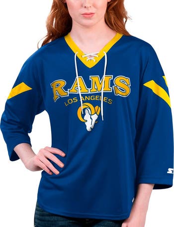The Women's Starter Royal Los Angeles Rams Rally Lace-Up 3/4 Sleeve T-shirt is the perfect way to show unwavering support for the Los Angeles Rams. Screen-print graphics and sewn-on sleeve stripes proudly display team spirit. The V-neck and lace-up neckline add style, while the rounded droptail hem provides a comfortable fit. Made from durable polyester, this T-shirt is perfect for cheering on the Rams at the stadium or showing support around town.