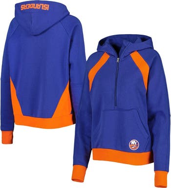 The Women's Starter Royal New York Islanders Wishbone Half-Zip Hoodie is the perfect way to show your support for the New York Islanders. This midweight hoodie is made from a soft cotton and polyester blend, featuring embroidered graphics, a fleece lining, and a front pouch pocket. Mesh insets and raglan sleeves provide a comfortable fit, while rib-knit insets and thumbholes in cuffs add style. Whether you're cheering on the Islanders at the rink or relaxing at home, this hoodie will keep you warm and comfortable.