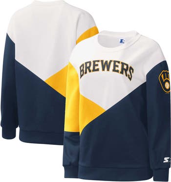 The Women's Starter White/Navy Milwaukee Brewers Shutout Pullover Sweatshirt is the perfect way to show your support for the Milwaukee Brewers. Made from a comfortable cotton and polyester blend, this midweight sweatshirt features a French terry lining for added warmth during chilly game days. Embroidered graphics and a screen print graphic on the sleeve proudly display your Brewers pride, while the rib-knit cuffs and waist ensure a snug fit. Whether you're cheering from the stands or simply showing your support, this sweatshirt is the perfect way to represent the Milwaukee Brewers in style.