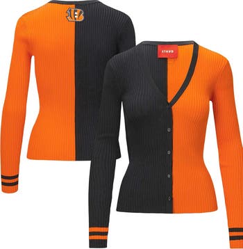 The STAUD Black/Orange Cincinnati Bengals Cargo Sweater is a must-have for devoted Cincinnati Bengals fans. Striking contrast-color trims and sleeve stripes make this lightweight sweater perfect for mild temperatures. The embroidered fabric applique proudly displays the Cincinnati Bengals logo, showcasing unwavering support for the team. Whether cheering from the stands or showing Bengals pride, this sweater represents your favorite NFL team in style.