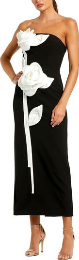 Strapless midi dress with sculptural 3D floral appliqués and a sleek silhouette. A bold, artistic look perfect for cocktail parties or special events.