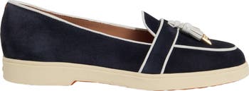 The ultimate women's loafer for off-duty looks and city living. This style reinterprets the classic footwear staple through a modern lens, characterised by a structured shape with a rounded toe and a rubber sole. Its suede design is enriched with contrast leather trims, tassels and small metal details inspired by our iconic double buckle.