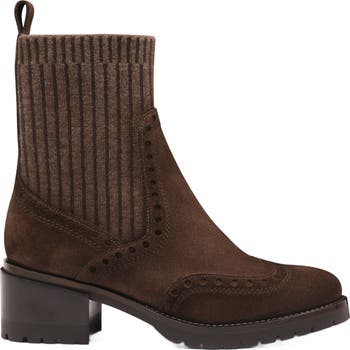 The classic women's ankle boot is refreshed with refined materials and artisanal finishes. This suede style is enriched with our artisanal “velatura” coloring technique for a distinctive gradated finish. Classic brogue detailing balances out the laid-back attitude of its rib-knit shaft, whilst a chunky rubber sole and pull tab ensure effortless comfort and convenience.