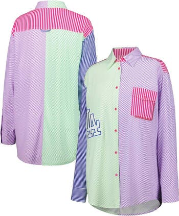 The Terez Los Angeles Dodgers Button-Up Shirt is the perfect way to show your support for the Dodgers. Made from soft rayon, this flowy shirt features an embroidered fabric applique of the Dodgers logo, a chest pocket with button closure, and two-button cuffs. The rounded droptail hem adds a touch of style, while the relaxed fit ensures a comfortable wear. Whether you're cheering on the Dodgers at the stadium or just showing your team spirit, this button-up shirt is a must-have for any fan.