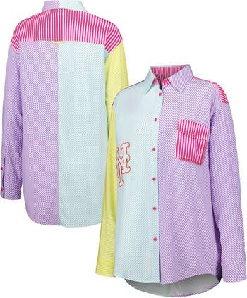 The Terez New York Mets Button-Up Shirt is the perfect way to show your support for the New York Mets. Made from soft rayon, this flowy shirt features a rounded droptail hem and two-button cuffs for a comfortable and stylish fit. The one chest pocket with button closure provides convenient storage for your essentials. Whether you're cheering on the Mets at the stadium or just showing your team spirit around town, this button-up shirt is a must-have for any New York Mets fan.