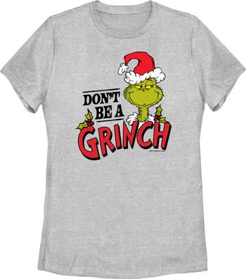 - Strut your stuff with this stylish new Christmas women's t-shirt that is perfect for the holidays! Featuring the mischievous Grinch wearing a Santa hat alongside the phrase: "Don't be a Grinch" printed in black and red lettering.