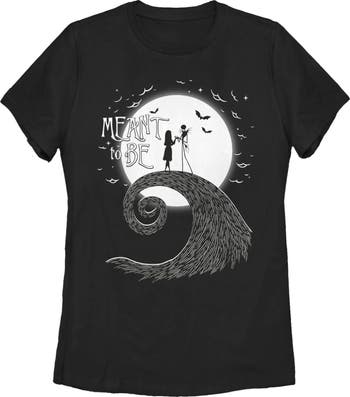 - Own the moment with this stylish new Halloween Women's T-Shirt that is perfect for the Scary season! Featuring the silhouettes of Jack Skellington and Sally on top of Spiral Hill holding hands alongside the text "Meant to Be" and a bright moon in the background.