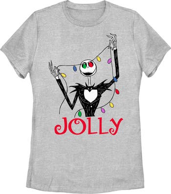 - Strut your stuff with this stylish new women's t-shirt that is perfect for the holidays! Featuring Jack playing with colorful Christmas lights and the word "Jolly" printed in red lettering below him.