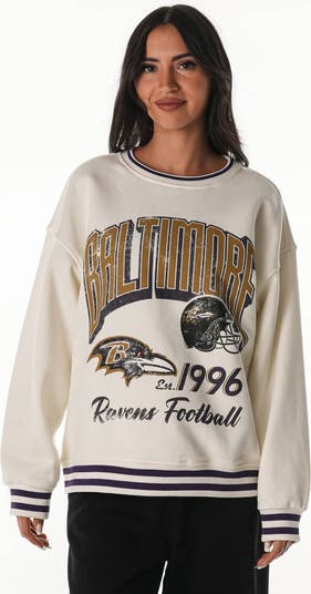 Kick back in style and comfort with this Baltimore Ravens Oversized Vintage French Terry Sweatshirt from The Wild Collective. The midweight fleece offers all-season wear, while the oversized fit and dropped shoulders create a relaxed silhouette. Distressed printed Baltimore Ravens graphics and striped ribbed trim add a vintage touch, making this sweatshirt the perfect way to rep your team on game day.