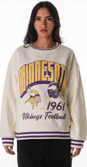 Kick back in style and comfort with this Minnesota Vikings Oversized Vintage French Terry Sweatshirt from The Wild Collective. The midweight fleece offers all-season wear, while the oversized fit and dropped shoulders create a relaxed silhouette. Distressed printed Minnesota Vikings graphics and striped ribbed trim add a vintage touch, making this sweatshirt the perfect way to rep your team on game day.