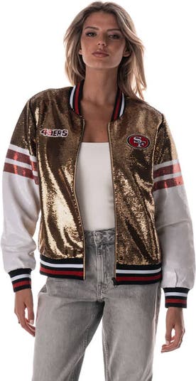 Add some glitz to your San Francisco 49ers gear with this Sequin Bomber Jacket from The Wild Collective. The all-over sequins and contrasting color sleeves create a bold and trendy look that's sure to make you stand out in any crowd. The lined interior and ribbed trim provide a comfortable, classic fit while the embroidered San Francisco 49ers details show off your unwavering team spirit.