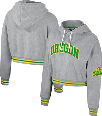 The Women's The Wild Collective Heather Gray Oregon Ducks Cropped Shimmer Pullover Hoodie is the perfect way to show your support for the Oregon Ducks. This cropped hoodie features distressed details for a vintage look, dropped shoulders for a relaxed fit, and embroidered graphics that proudly display your Oregon Ducks pride. Sequin details add a touch of sparkle, making this hoodie perfect for game day or any day you want to show your team spirit. Made from a soft cotton and polyester blend, this hoodie is comfortable and stylish, perfect for any Oregon Ducks fan.