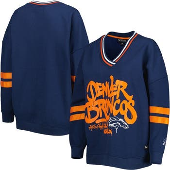 The Women's The Wild Collective Navy Denver Broncos Vintage V-Neck Pullover Sweatshirt is the perfect way to show unwavering support for the Denver Broncos. Crafted from a soft cotton and polyester blend, this midweight sweatshirt features a cozy fleece lining for added warmth during chilly game days. The low puff screen print graphics proudly display the Denver Broncos logo, while sewn-on sleeves stripes and woven fabric applique add a touch of vintage flair. Whether cheering from the stands or simply showing support, this sweatshirt is the perfect way to represent the Denver Broncos in style.