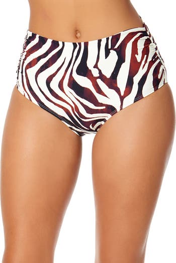 Dance through your sunny days with this Tiger Dance Fold Over High Waist Shirred Bikini Bottom. This chic swim bottom features a high waist design with stylish shirring for a comfortable, flattering fit. The fold over waistband can be adjusted to high waist and low waist, while providing a full-coverage silhouette. This bottom's lively Tiger Dance print will also bring a playful flair to your swimwear collection. Complete your beach look with our matching bikini top! Model is wearing a size Small