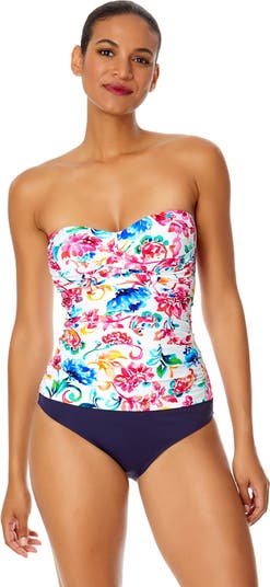 Stand out in style with our Tiger Dance Twist Front Bandeaukini Swim Top, a versatile piece perfect for mixing and matching. Featuring a bold tiger-inspired print, this tankini will give you a look of effortless sophistication. The twist front detail adds an elegant touch, while molded sewn-in cups and adjustable straps offer personalized comfort and support. Side shirring enhances your natural shape, making this top a flattering choice for any sunny occasion. Pair with a matching Anne Cole swim bottom for the perfect look!.Model is wearing a size small She usually wears a standard US dress size 4/6, bra size 32C, and has a 25” waist and 36” hipsAdjustable Straps