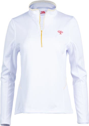 Our 1/4 Zip Long Sleeve Athletic Top is made from lightweight, UV-protective pique spandex for breathable comfort and performance. It features polka dot trim detail at the neckline and a coordinating zipper in blue or pink, adding a stylish touch. Finished with our signature embroidered crossed heart logo on the top left.
