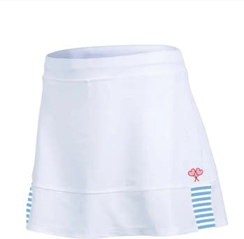 The Tracy Skirt is made from lightweight, UV-protective pique spandex, offering comfort and performance. Featuring retro styled striped trim along the sides and a flattering side slit hem at each side, this athletic skort combines style and functionality. Available in contrasting trim colors of blue or pink stripes, it is finished with our signature embroidered crossed heart logo on the left.