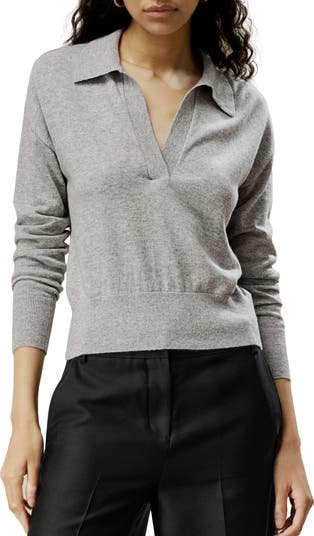 With dropped shoulder seams, the relaxed yet feminine silhouette of this open-neck polo highlights the plush texture of featherweight cashmere. The ribbed trim accents the neckline, ribbed cuffs, and hem, making it a versatile piece for all seasons.