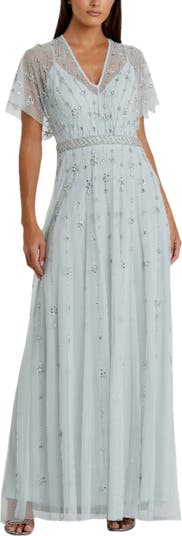 This stunning gown features beaded floral embellishments, an A-line silhouette, sheer flutter sleeves, and a beaded waist, perfect for weddings, galas, or evening events.