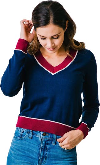 Our classic fine gauge v-neck sweater combines authentic original detailing with soft organic cotton and a flattering, feminine cut. Features contrast stripes at the neck, cuffs, and hem in an easy pullover silhouette. Pairs perfectly with jeans or leggings, and can even be layered with a white turtleneck for a collegiate cool vibe. A crisp, preppy look!