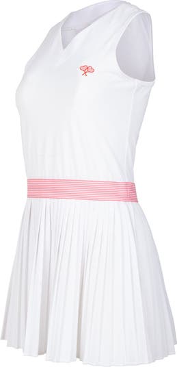 The Virginia Dress is made from lightweight, UV-protective Lycra spandex for comfort and performance. This sleeveless athletic dress features a stretch elastic waistband in pink or yellow and narrow petite pleats, offering both style and ease of movement. Named for Virginia Wade, a British former professional tennis player who won three major singles championships and four major doubles championships. She remains the only British woman in history to have won titles at all four majors. Wade was ranked No. 2 in the world in singles and No. 1 in doubles.
