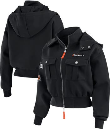 Show your Cincinnati Bengals pride with this Patch Pocket Cropped Full-Zip Bomber Jacket from WEAR by Erin Andrews. The cropped length adds a modern edge, while the removable scuba hood and mock neck provide customizable comfort. Featuring team name patches and the iconic logo, this bomber jacket is the perfect blend of fashion and Cincinnati Bengals pride.