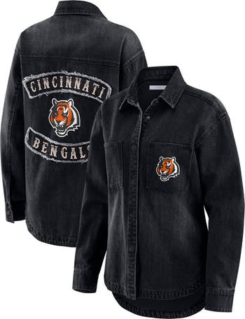 Throw on an extra layer of Cincinnati Bengals style with this Washed Oversized Denim Full-Snap Shacket from WEAR by Erin Andrews. This shirt-style jacket offers a relaxed fit for comfortable layering and a rounded droptail hem for a flattering silhouette. Screen print Cincinnati Bengals graphics and a printed wordmark on the back add a touch of team spirit to this fashionable piece.