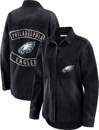 Throw on an extra layer of Philadelphia Eagles style with this Washed Oversized Denim Full-Snap Shacket from WEAR by Erin Andrews. This shirt-style jacket offers a relaxed fit for comfortable layering and a rounded droptail hem for a flattering silhouette. Screen print Philadelphia Eagles graphics and a printed wordmark on the back add a touch of team spirit to this fashionable piece.
