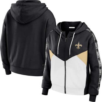 The Women's WEAR by Erin Andrews Black/White New Orleans Saints Plus Size Color Block Full-Zip Hoodie is the perfect way to show unwavering support for the New Orleans Saints. This midweight hoodie features a cozy fleece lining, ensuring warmth during chilly game days. The bold color block design and sewn-on stripes with sublimated graphics proudly display Saints pride. Whether cheering from the stands or showing support, this hoodie represents the New Orleans Saints in style.