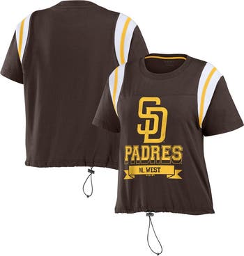 The Women's WEAR by Erin Andrews Brown San Diego Padres Cinched Colorblock T-shirt is the perfect way to show your support for the San Diego Padres. With distressed details for a vintage look and adjustable drawstring with toggle at the waist hem, this shirt is both stylish and comfortable. Rib-knit insets in the shoulders and front yoke seam add a touch of sophistication, while the San Diego Padres logo proudly displayed on the front shows your team spirit. Made from soft cotton, this shirt is perfect for any occasion, whether you're cheering on the Padres at the game or just relaxing at home.