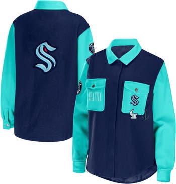 Add a unique finish to any Seattle Kraken look with this button-up shirt jacket from WEAR by Erin Andrews. It features an eye-catching colorblock design with Seattle Kraken patches and graphics for a spirited game day outfit. Plus, the cozy midweight design supplies extra warmth for comfort.