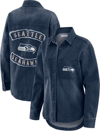 Throw on an extra layer of Seattle Seahawks style with this Washed Oversized Denim Full-Snap Shacket from WEAR by Erin Andrews. This shirt-style jacket offers a relaxed fit for comfortable layering and a rounded droptail hem for a flattering silhouette. Screen print Seattle Seahawks graphics and a printed wordmark on the back add a touch of team spirit to this fashionable piece.