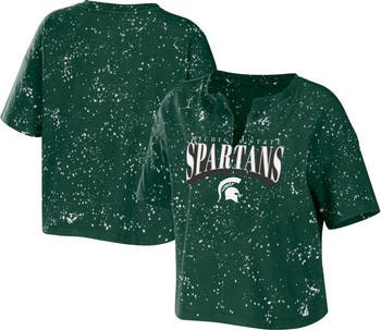 Women's WEAR by Erin Andrews Green Michigan State Spartans Bleach Wash Splatter Cropped Notch Neck T-Shirt