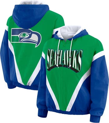 Women's WEAR by Erin Andrews Kelly Green/Royal Seattle Seahawks Plus Size Retro Crinkle Full-Zip Hoodie Windbreaker Jacket