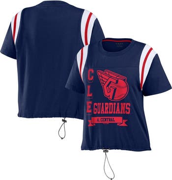 Celebrate your unwavering loyalty to the Cleveland Guardians with the Women's WEAR by Erin Andrews Navy Cleveland Guardians Cinched Colorblock T-shirt. This stylish tee features distressed details for a vintage look, an adjustable drawcord in the waist hem for a customized fit, and rib-knit insets in the shoulders for added comfort. The front yoke seam adds a touch of sophistication, while the bold Cleveland Guardians graphics proudly display your team spirit. Made from soft cotton, this t-shirt is perfect for game day or any day you want to show your support for the Guardians.