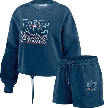 Women's WEAR by Erin Andrews Navy New England Patriots Washed Fleece Long Sleeve T-Shirt & Shorts Lounge Set