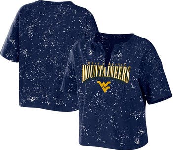 The Women's WEAR by Erin Andrews Navy West Virginia Mountaineers Bleach Wash Splatter Cropped Notch Neck T-shirt is a stylish way to show unwavering support for the West Virginia Mountaineers. The unique bleach-wash design adds individuality, while the cropped fit and splatter bleach design create a modern, eye-catching look. Whether cheering from the stands or showing Mountaineers pride, this T-shirt is the perfect way to represent your favorite team in style.