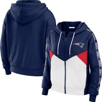Women's WEAR by Erin Andrews Navy/White New England Patriots Color Block Light Weight Modest Crop Full-Zip Hoodie
